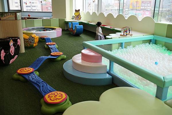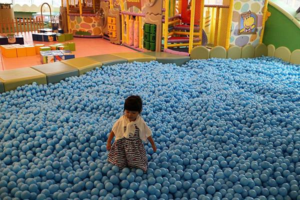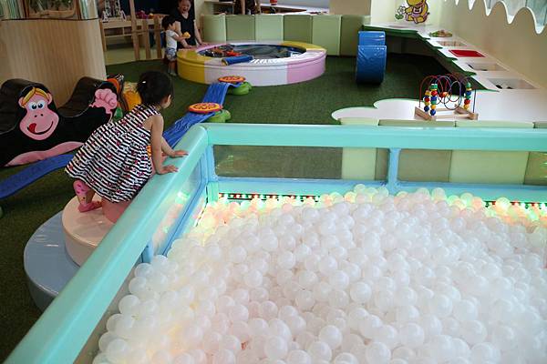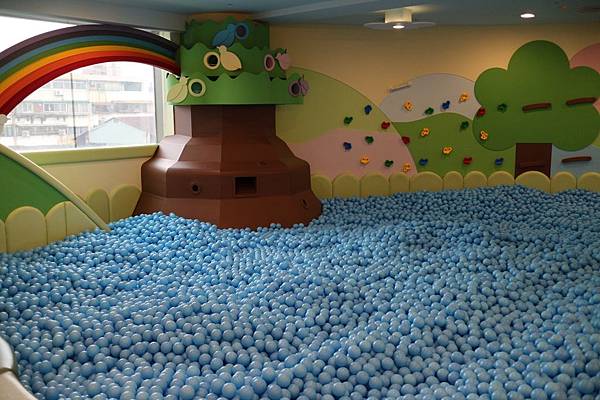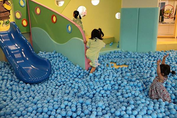 還有一座溜滑梯,連踩階梯上去都是軟墊喔~只是這裡的球不像「大樹先生的家」來的堅固,不時有看到破損的情形,為了怕割傷小朋友我都把它撿到角落放