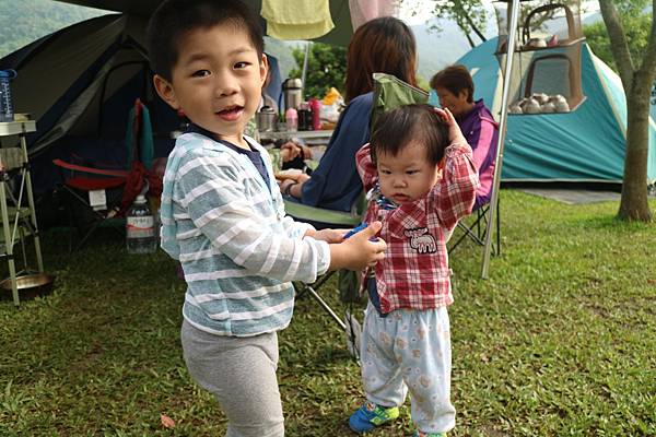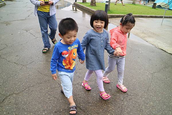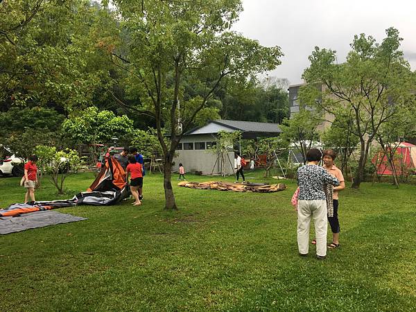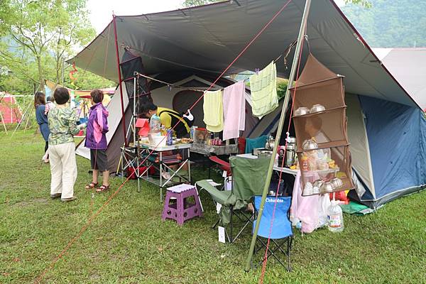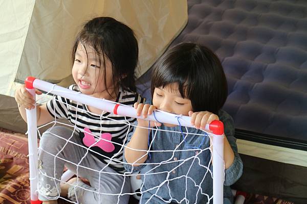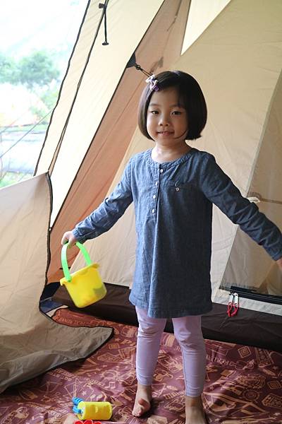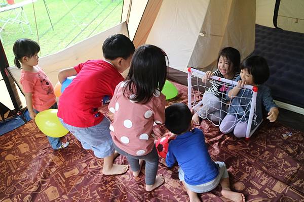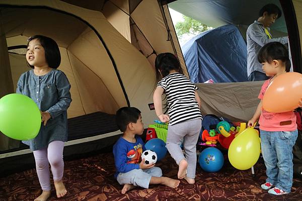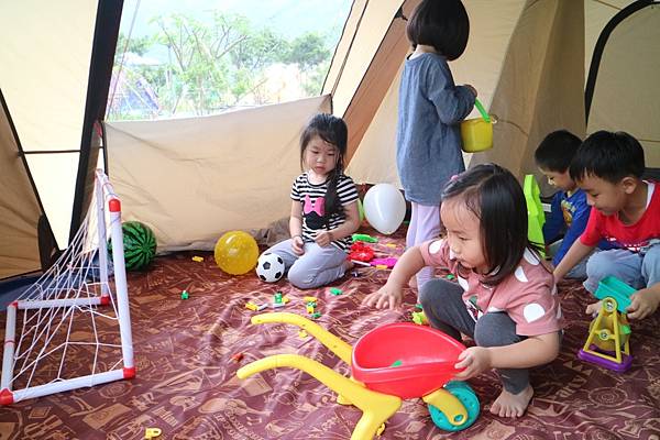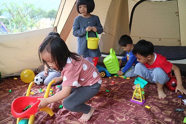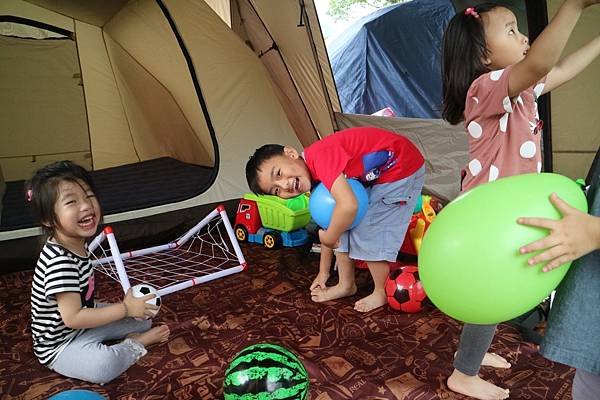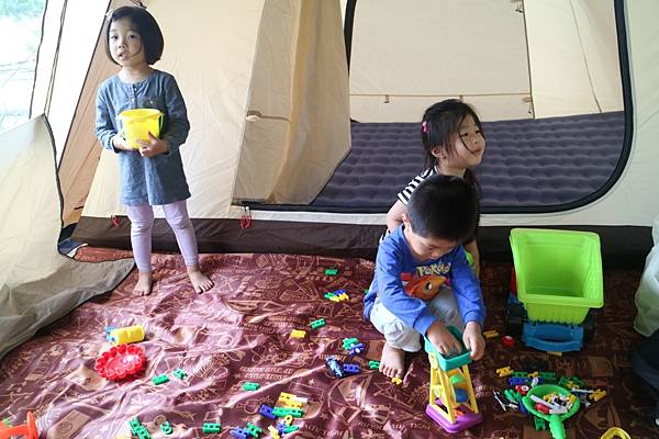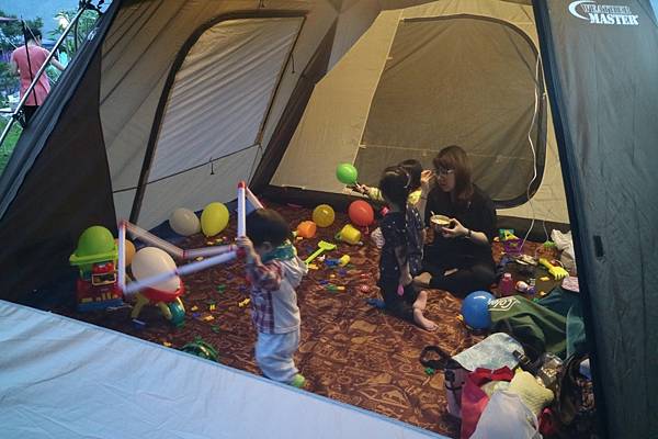 雨下不停,小孩只好躲在帳棚裡玩,有這樣的空間,讓他們玩的好高興啊!玩具散落各處也隨他們玩了......
