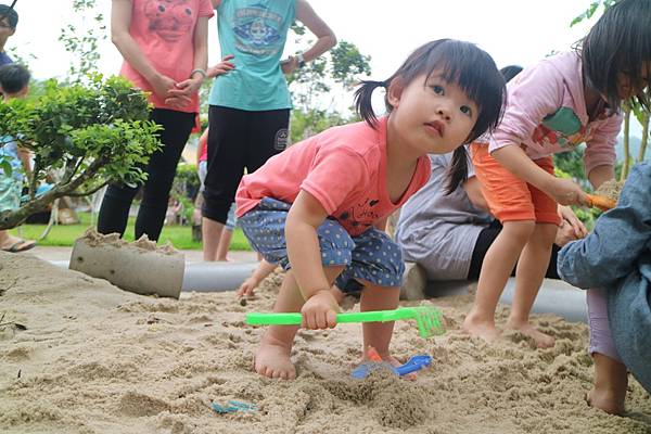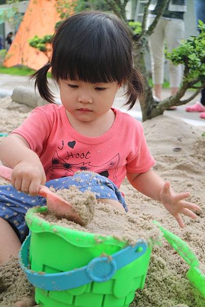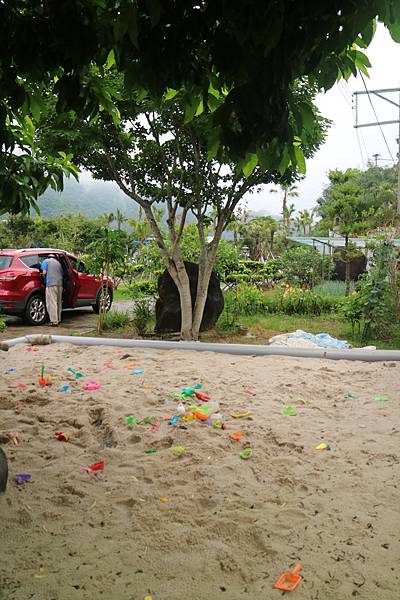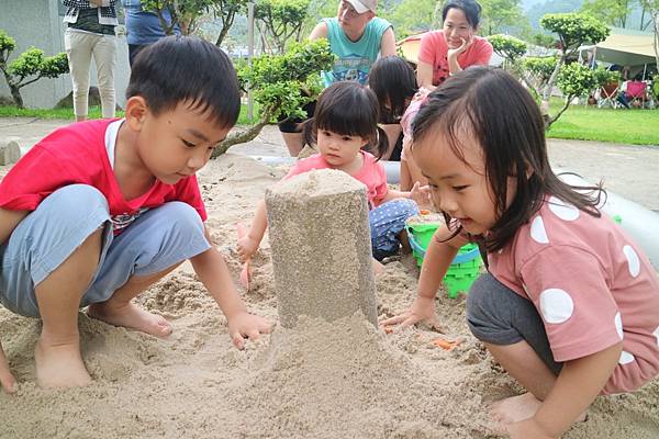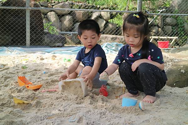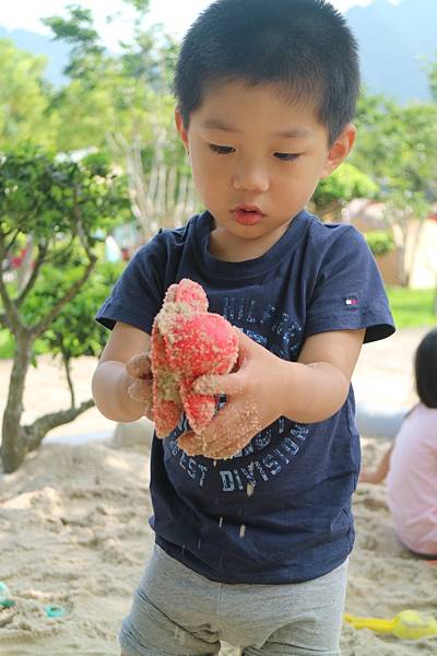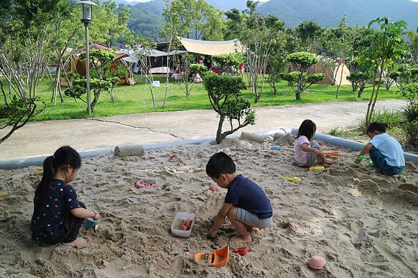 沙子很細,而且沙坑也有現成的玩沙工具,所以就將自己帶來的玩沙工具組就留在帳棚裡玩囉