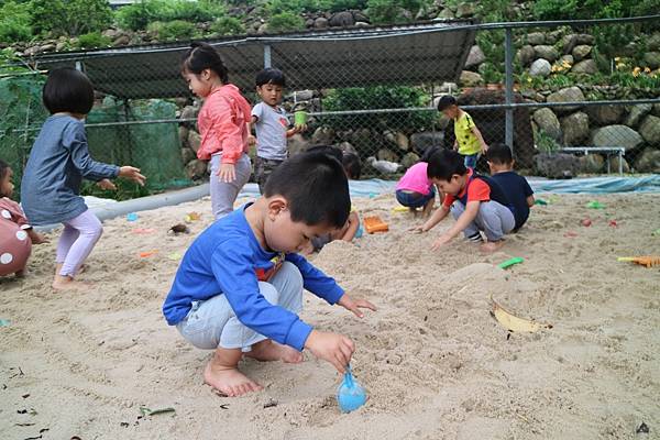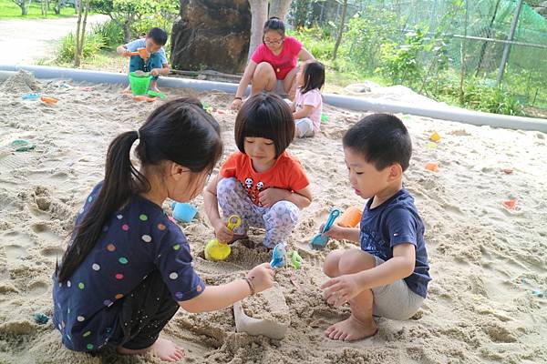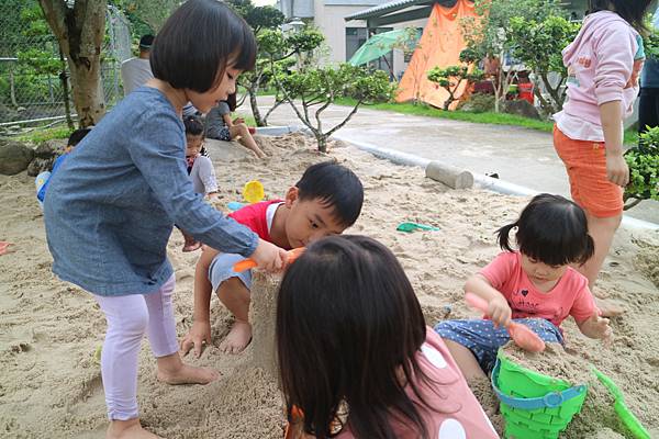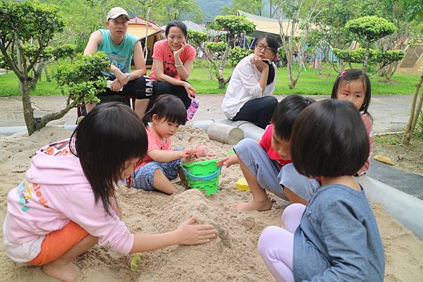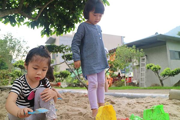 露出的陽光,將沙子不再那麼濕潤,吵著要玩沙的孩子們就讓他們跟著玩囉~一旁的玉蘭花樹隨著風吹,花香撲鼻而來~
