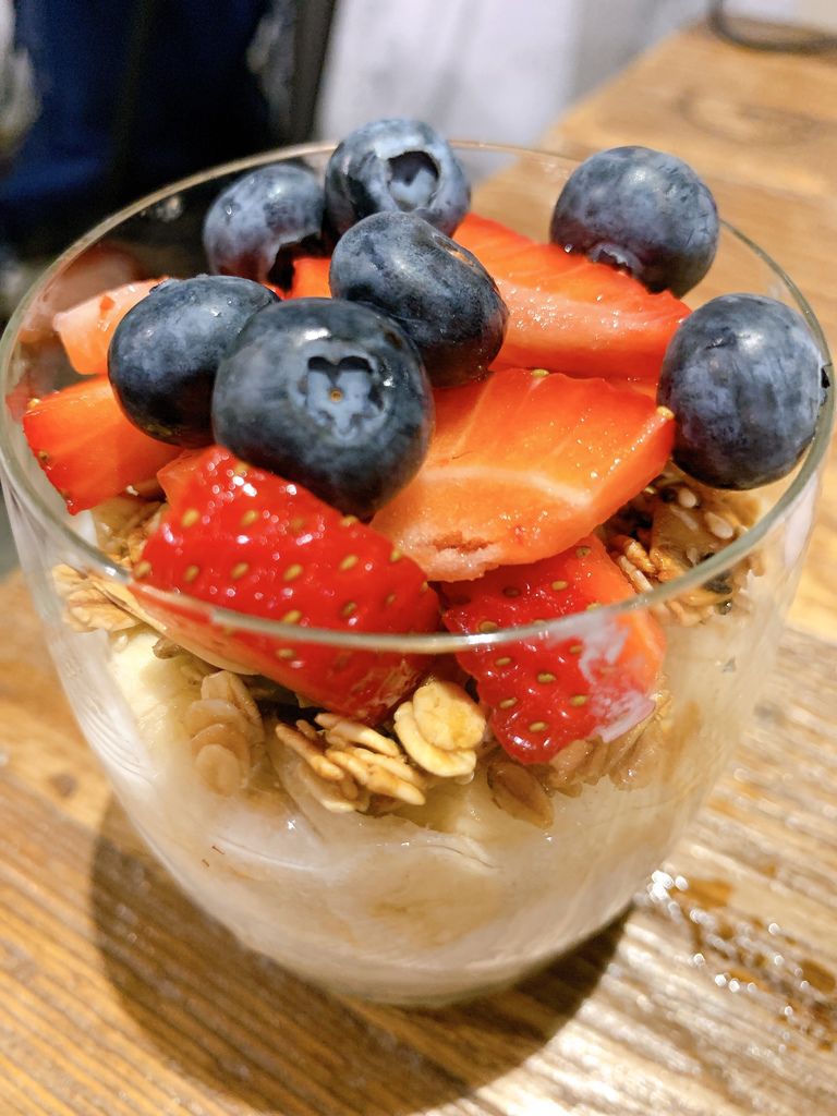 水果優格燕麥杯,裡面有香蕉、奇異果、草莓、堅果、燕麥,尤其是堅果燕麥有額外處理過,反而有股香氣在,好好吃喔!