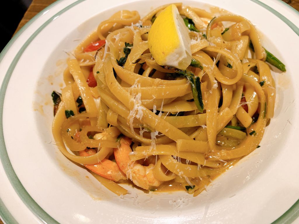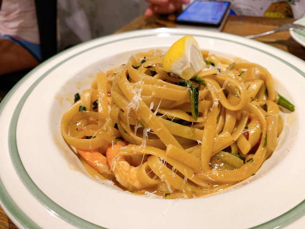 蒜香鮮蝦菠菜番茄扁麵,這道則是重口味,但是麵條很Q彈