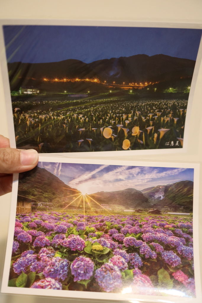 離開時入園費可以兌換明信片或圓扇,我倆決定兌換明細片,並挑選竹子湖花季盛開的海芋及繡球花作紀念