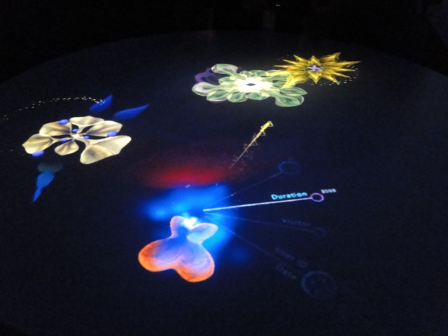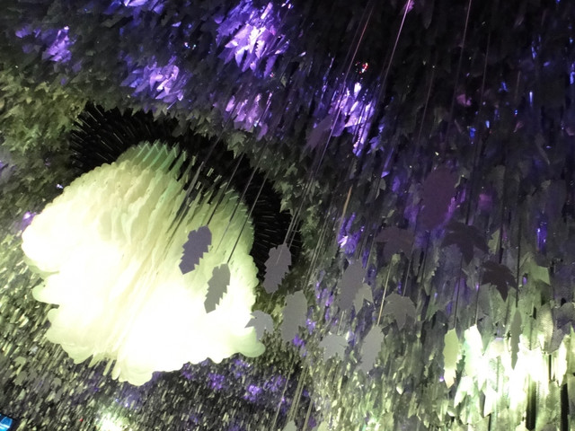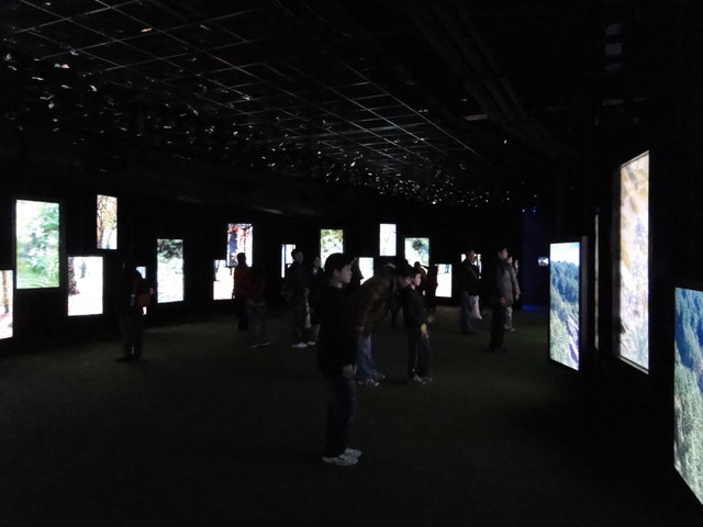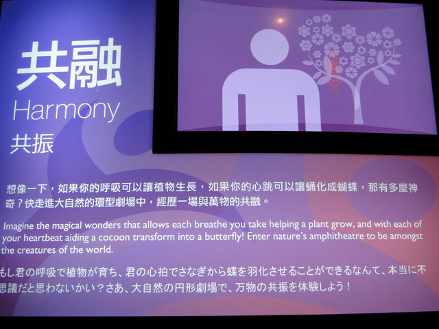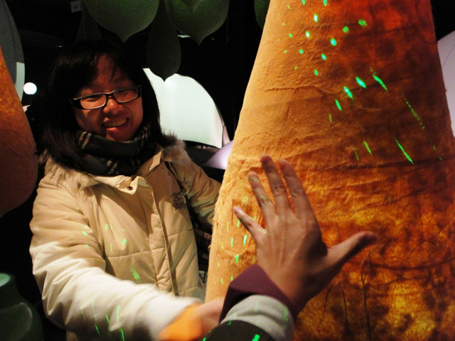 360度的生態劇場,看到雲海、森林的變幻,出現一棵樹後,會有一個光圈點,手放在光圈上,小樹就會慢慢茁壯,變成一棵翠綠的大樹。
