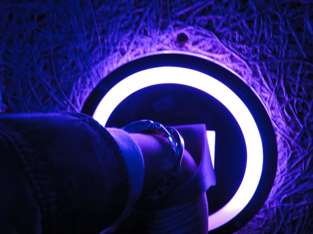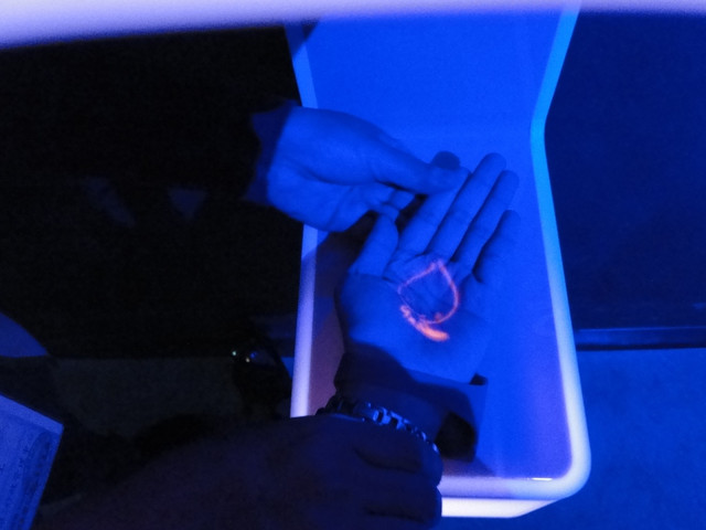 將手環放置在機器上,手掌向上,讓能量進入你的身體,掌心會出現「芽比」的圖案。
