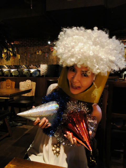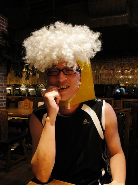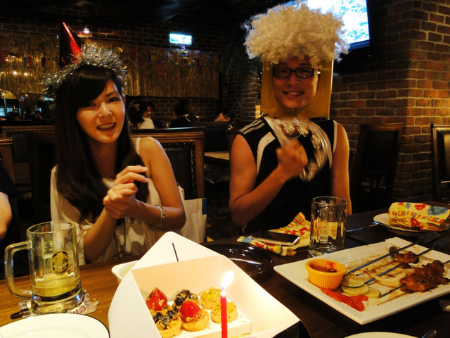 用餐時,看到前一桌客人慶生時,店家會主動提供道具慶生,於是我們也想要來一起融入慶生氣氛一下,奇怪,壽星不是南璇嗎?那專屬啤酒杯造型是壽星專用的ㄛ!怎麼淪為林桑戴了呢?