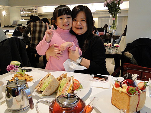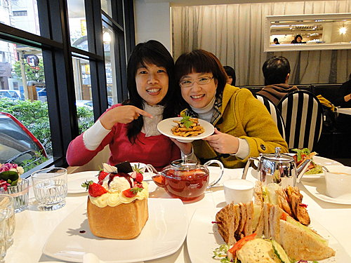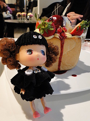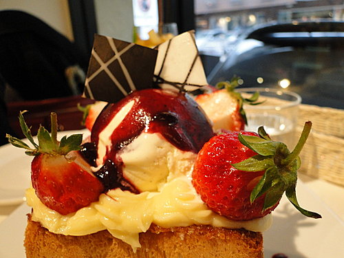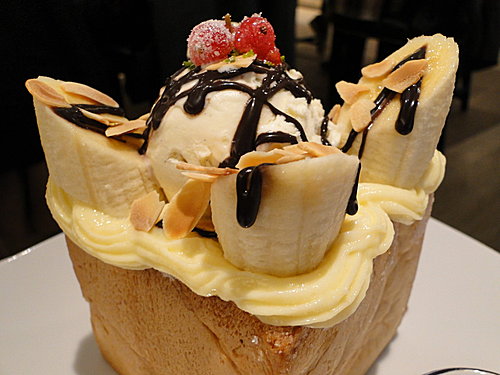 秘釀紅梅醬蜜糖土司,剛開始從上頭的冰淇淋等配料開始吃,直到服務生看到我們的吃法看不下去,趕緊教我們正確吃法,原來要先把冰淇淋移開,然後將裡面的蜜糖土司條夾出,沾卡士達醬和冰淇淋吃!