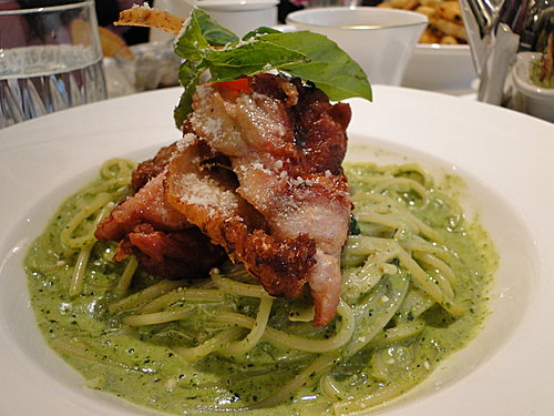杏玫的青醬雞肉麵,吃完整盤,杏玫就覺得很飽了,還直嚷嚷著很膩....